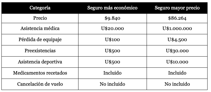 En términos de prestaciones, las diferencias son estructurales. En asistencia médica, la cobertura varía entre U$20.000 y U$1.000.000. En equipaje, entre U$100 y U$4.500, mientras que en enfermedades preexistentes los montos van desde U$500 hasta U$30.000. La asistencia médica deportiva también presenta diferencias relevantes, con coberturas que van desde U$500 hasta U$10.000. En tanto, ambas alternativas incluyen medicamentos recetados, pero ninguna contempla gastos por cancelación de vuelo.